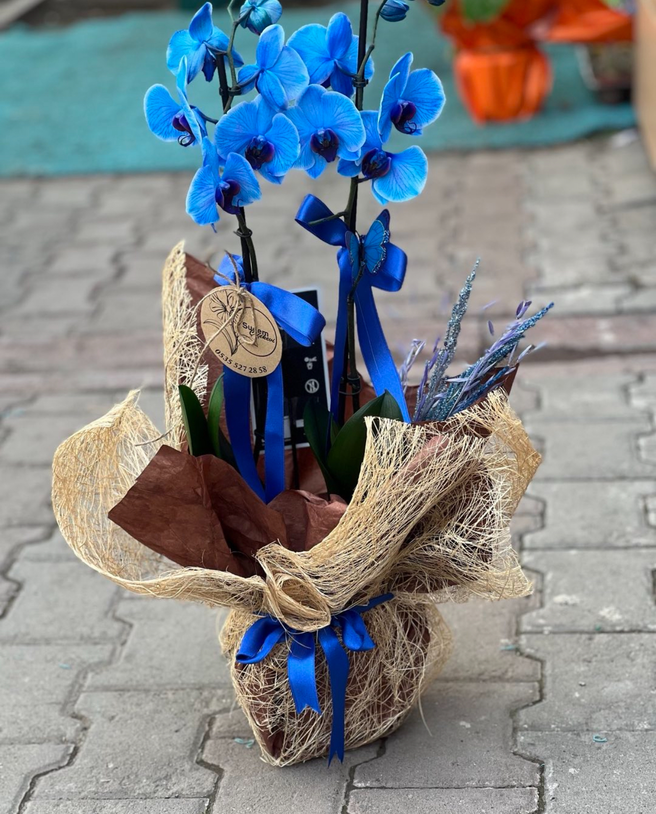 Mavi Çift Dal Orkide – Özel Hasır Sargılı