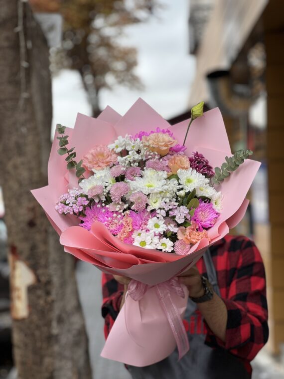 Pembe sargılı karışık çiçek buketi, zarif görünümü ve canlı renkleriyle sevdiklerinize mutluluğu en özel haliyle ulaştırır. İçerisinde pembe, beyaz ve mor tonlarında karışık mevsim çiçekleri bulunan bu şık aranjman; doğum günü, sevgililer günü, yıldönümü ya da sürpriz bir kutlama için mükemmel bir tercihtir.